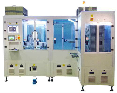 自動化移印機設備,包括:旋轉伺服工作臺、移印機結構、油盅,油杯油墨盤、送料機構、出料通道、進料抓取機構和出料抓取機構,該旋轉工作臺上設置有若干個不斷轉動而改變其與移印機構、進料抓取機構和出料抓取機構相對應位置關系的移印工作位,該移印工作位至少包括進料位、自動移印位以及出料位,該送料機構具有送料通道,該移印機構和油墨盤位于旋轉工作臺的移印位周邊以對產品進行移印操作,該送料通道出口和進料抓取機構位于旋轉工作臺的進料位周邊以讓進料抓取機構將產品抓取至進料位處,該出料通道入口和出料抓取機構位于旋轉工作臺的出料位周邊以讓出料抓取機構將產品抓取至出料通道中。本實用新型具有自動化程度高和移印效果好的特點。